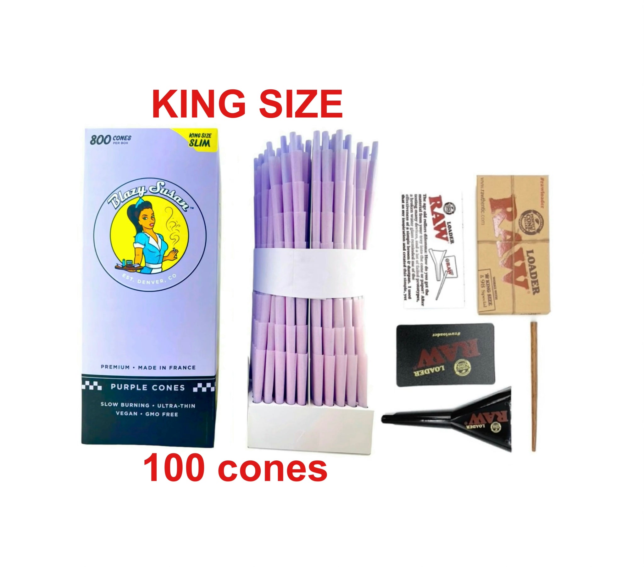 Roll in style with the iconic Purple Pre Rolled Purple King Size Cones. These ultra-chic cones are made with our world-famous Blazy Susan Purple rolling paper, crafted from premium, non-GMO Fine French paper for a smooth, slow burn every time.